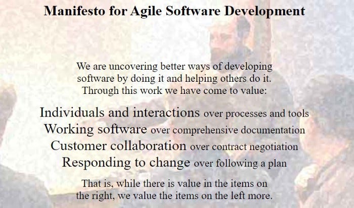 Going back to the Agile Manifesto and looking at it more closely I notice three salient facts that help make it clearer: